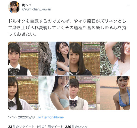 1: 名無し46がお送りします 2022/12/13(火) 17:47:13.60 ID:Ju4MMCWkd ちょっとキモいなこれ 2: 名無し46がお送りします 2022/12/13(火) 17:48:04.80 ID:wFuTDGzia この楽しみ方するなら写真集は嫌そうな顔しないと 6: 名無し46がお送りします 2022/12/13(火) 17:51:14.45 ID:O6Zy7ZIgM >>2 これ 7: 名無し46がお送りします 2022/12/13(火) 17:52:03.58 ID:bfX41rtZ0 >>2 うむ 8: 名無し46がお送りします 2022/12/13(火) 17:56:21.22 ID:mBUUTHCG0 >>2 これ 画像だとどっちも楽しそうやんな 4: 名無し46がお送りします 2022/12/13(火) 17:48:55.90 ID:QU2WOyEld 芸能の厳しさだねぇ 5: 名無し46が...