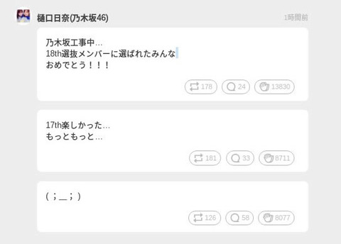 乃木仮めんばー 全7008件取得 32/234 前の30件 次の30件 2017年7月11日71991 まとめ 乃木仮めんばー 【乃木坂46】鈴木絢音『大潟村応援大使』就任で"地元新聞&ニュース番組"に登場! 0 0 0 2017年7月11日71987 まとめ 乃木仮めんばー 【乃木坂46】映画『あさひなぐ』劇場前売特典に8巻までの表紙をキャストが再現!7月14日より発売! 0 0 0 2017年7月11日71975 まとめ 乃木仮めんばー 【乃木坂46】西野七瀬"オフショルで流しそうめん"『七瀬のひんやり麺』ムービー第二弾を公開! 0 0 0 2017年7月11日71957 まとめ 乃木仮めんばー 【乃木坂46】映画『あさひなぐ』主題歌は乃木坂46『いつかできるから今日できる』に決定!"予告&ポスタービジュアル"を公式解禁! 0 0 0 2017年7月10日71707 2017年7月11日71940 まとめ 乃木仮めんばー 【乃木坂46】寺田蘭世"ファッション誌初単独表紙"7月14日発売『melt KAWAII FASHION BOOK 00』の表紙を公開! 0 0 0 2017年7月11日71923 まとめ 乃木仮めんばー 【乃木坂46】『UTB 9月号』特典ポストカードを公開!&齋藤飛鳥の『暑中見舞いキャンペーン』ムービー!…etc【小ネタまとめ】 0 0 0 2017年7月11日71906 まとめ 乃木仮めんばー 【乃木坂46】『のぎえいご』でうっかり答えを歌い出す大園桃子がこちらwww 0 0 0 2017年7月10日71895 まとめ 乃木仮めんばー 【乃木坂46】次回乃木坂工事中『ヒム子×乃木坂46』夢の共演、知られざる舞台裏に完全密着! 0 0 0 2017年7月10日71887 まとめ 乃木仮めんばー 【乃木坂46】伊藤理々杏×山下美月の『3期も絶対支えてくれるから』って言われた時の笑顔… 0 0 0 2017年7月10日71886 まとめ 乃木仮めんばー 【乃木坂46】新センター与田祐希がブログで決意表明!『努力 感謝 笑顔』 0 0 0 2017年7月10日71883 まとめ 乃木仮めんばー 【乃木坂46】衛藤美彩×斉藤優里×桜井玲香×堀未央奈『乃木坂46の食べるだけ』第2弾に出演決定!7月19日深夜放送! 0 0 0 2017年7月10日71882 まとめ 乃木仮めんばー 【乃木坂46】乃木坂×じゃらん『巨大ポスター』がマジでデカい件!良いなこれwww 0 0 0 2017年7月10日71880 まとめ 乃木仮めんばー 【乃木坂46】山下美月"ずっきゅん・ビーム・パンチ・ガオー"も披露!15分間『SHOWROOM』に登場! 0 0 0 2017年7月10日71707 2017年7月10日71872 まとめ 乃木仮めんばー 【乃木坂46】山下美月が『SHOWROOM』初配信中! 0 0 0 2017年7月10日71868 まとめ 乃木仮めんばー 【乃木坂46】鈴木絢音『秋田県大潟村 応援大使』に就任!7月11日『ごくじょうラジオ』にてコメント! 0 0 0 2017年7月10日71861 まとめ 乃木仮めんばー 【乃木坂46】『18thシングル選抜』についての考察 0 0 0 2017年7月10日71856 まとめ 乃木仮めんばー 【乃木坂46】3期生のレギュラー番組が決定!7月22日より『のびのび乃木坂 3期生!!』の放送がスタート! 0 0 0 2017年7月10日71849 まとめ 乃木仮めんばー 【乃木坂46】18thWセンター大園桃子×与田祐希「18枚目よろしくお願いします!」3番目の風が吹いたな…【乃木坂工事中】 0 0 0 2017年7月10日71831 まとめ 乃木仮めんばー 【乃木坂46】18th選抜発表『フロント1・2・5・6番』西野七瀬「個人的に割りと笑うことが増えてきた…」【乃木坂工事中】 0 0 0 2017年7月10日71818 まとめ 乃木仮めんばー 【乃木坂46】18th選抜発表『2列目10~12番』秋元真夏、コケる!www【乃木坂工事中】 0 0 0 2017年7月10日71808 まとめ 乃木仮めんばー 【乃木坂46】18th選抜発表『2列目7~9番』星野みなみ「もうちゃんとしますね。」【乃木坂工事中】 0 0 0 2017年7月10日71790 まとめ 乃木仮めんばー 【乃木坂46】まいやんキタ━━(゚∀゚)━━!!特別Ver.動画第四弾『マウスダンス サマーウス 白石麻衣篇』を公開! 0 0 0 2017年7月10日71781 まとめ 乃木仮めんばー 【乃木坂46】伊藤衆人監督「おこがましくてずっと言ってなかったけど今日は言いたい。いつかでいいからボーダー撮りたい。」 0 0 0 2017年7月10日71769 まとめ 乃木仮めんばー 【乃木坂46】18th選抜発表『3列目16~18番』井上小百合「乃木坂が一つの方向を見れるように…」さゆ大人になったな!【乃木坂工事中】 0 0 0 2017年7月10日71766 まとめ 乃木仮めんばー 【乃木坂46×じゃらん】『巨大ポスター』絵柄を公開!乃木坂駅周辺のセブンイレブン500店舗で各40部を無料配布!【めざましテレビ】 0 0 0 2017年7月10日71760 まとめ 乃木仮めんばー 【乃木坂46】18th選抜発表『3列目13~15番』新内眞衣の『得意の小ボケ』いい感じだな!【乃木坂工事中】 0 0 0 2017年7月10日71746 まとめ 乃木仮めんばー 【乃木坂46】樋口日奈 18th選抜発表への『想い』を吐露…これは泣いてもいい… 0 0 0 2017年7月10日71743 まとめ 乃木仮めんばー 【乃木坂46】セブン限定特典『18thシングル』タイプ別"生写真16種"のデザインを公開! 0 0 0 2017年7月10日71716 まとめ 乃木仮めんばー 【乃木坂46】アンダーライブ『九州シリーズ』出演メンバーが判明!3期生は不参加の模様! 0 0 0 2017年7月10日71707 まとめ 乃木仮めんばー 【乃木坂46】大園桃子×与田祐希『18thシングル』の"Wセンター"に決定! 0 0 0 ホーム 乃木仮めんばー 全7008件 前の30件 次の30件