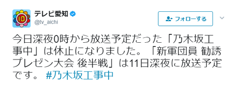 【乃木坂46】テレビ愛知「今日の乃木坂工事中は休止。軍団勧誘プレゼン大会後半戦は11日深夜に放送予定」