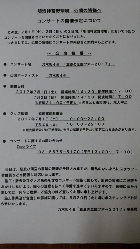 【乃木坂46】『真夏の全国ツアー2017@神宮』"近隣の皆様へ"を配布!開演17:00~終演21:00予定の模様!