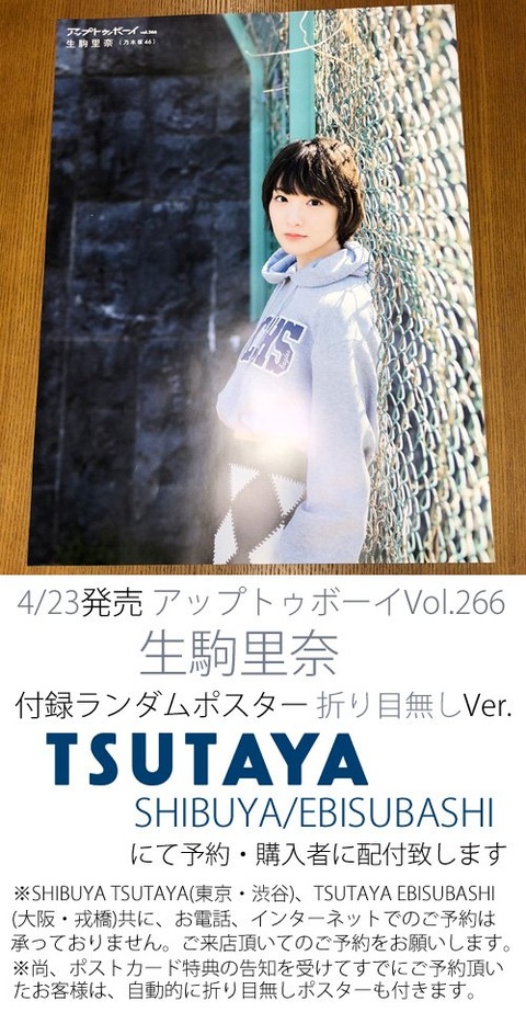 【乃木坂46】生駒里奈 4月23日発売『アップトゥボーイ』TSUTAYA SHIBUYA&EBISUBASHI特典ポスター公開!