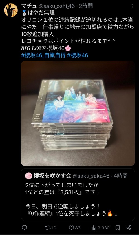 生駒ちゃんねる 全40603件取得 28/1354 前の30件 次の30件 2024年7月5日395805 まとめ 生駒ちゃんねる 【乃木坂配信中】たまトレに小川彩 0 0 0 2024年7月5日395794 まとめ 生駒ちゃんねる 明日の「THE MUSIC DAY」乃木坂46『おひとりさま天国』はオリメンで出演 0 0 0 2024年7月5日395790 まとめ 生駒ちゃんねる 『B.L.T. SUMMER CANDY 2024』表紙は乃木坂46冨里奈央 0 0 0 2024年7月5日395788 まとめ 生駒ちゃんねる 秋元康の乃木坂46弓木奈於1st写真集の帯コメント、弓木のこと知らなそう 0 0 0 2024年6月29日395317 2024年7月5日395766 まとめ 生駒ちゃんねる 乃木坂46梅澤美波がヨウジヤマモト「Ground Y」2024-25秋冬のキービジュアルモデルに就任 0 0 0 2024年7月5日395749 まとめ 生駒ちゃんねる 乃木坂46阪口珠美1st写真集『青いバラ』初週2.4万部 0 0 0 2024年7月4日395730 まとめ 生駒ちゃんねる 7/6(土)の「THE MUSIC DAY 2024」17時台に乃木坂46『おひとりさま天国』 0 0 0 2024年7月4日395718 まとめ 生駒ちゃんねる 7/6(土)12:00~「乃木坂46真夏の全国ツアー2024」一般発売は先着順 0 0 0 2024年7月4日395710 まとめ 生駒ちゃんねる 【乃木坂配信中】REI ENGLISHに4期生が一人ずつゲスト出演?松尾→弓木 0 0 0 2024年7月4日395702 まとめ 生駒ちゃんねる 7/26発売『B.L.T.9月号』表紙&巻頭は乃木坂46筒井あやめ!写真集はよ 0 0 0 2024年7月4日395690 まとめ 生駒ちゃんねる 「サシメン」vol.3は遠藤さくら×小川彩 0 0 0 2024年7月4日395677 まとめ 生駒ちゃんねる 「忍者CODE」新CMに乃木坂46久保史緒里が出演 0 0 0 2024年7月3日395654 まとめ 生駒ちゃんねる 「風とロック」乃木坂46×サンボマスターは7/7(日)20:15頃~ 0 0 0 2024年6月29日395317 2024年7月3日395636 まとめ 生駒ちゃんねる 月額1,320円の「のぎ動画」会員数は5万人 0 0 0 2024年7月3日395609 まとめ 生駒ちゃんねる 乃木坂46久保史緒里がNHK夜ドラ「未来の私にブッかまされる!?」に出演決定 0 0 0 2024年7月2日395582 まとめ 生駒ちゃんねる 7/3の乃木坂46「猫舌SHOWROOM」は梅澤美波&佐藤楓 0 0 0 2024年7月2日395561 まとめ 生駒ちゃんねる 相楽伊織、「音ボケPOPS」レギュラー就任 0 0 0 2024年7月2日395554 まとめ 生駒ちゃんねる 7/5放送「金曜日のメタバース」はガッチマンが選んだホラーゲームに乃木坂46理々杏&吉田が挑戦 0 0 0 2024年7月2日395527 まとめ 生駒ちゃんねる 【乃木坂スター誕生】ゲスト歌唱、五百城3回…池田・岡本・冨里0回 0 0 0 2024年7月2日395517 まとめ 生駒ちゃんねる 「日本怪奇ルポルタージュ」で乃木坂6期オーディションの告知w 0 0 0 2024年7月1日395458 まとめ 生駒ちゃんねる 乃木坂46岩本蓮加がカンテレの深夜ドラマ『そんな家族なら捨てちゃえば?』で竹財輝之助とW主演 0 0 0 2024年7月1日395455 まとめ 生駒ちゃんねる 【乃木坂工事中】遠藤さくらのカエル演芸「おっ?おっ?おっ?」 0 0 0 2024年7月1日395444 まとめ 生駒ちゃんねる 7/7の「らじらー」は藤森お休みで乃木坂46川﨑桜がひとりで放送 0 0 0 2024年6月30日395441 まとめ 生駒ちゃんねる 清宮レイ、乃木坂46卒業後も芸能活動は継続!藤森「今後お仕事でお会いできるかもしれない」 0 0 0 2024年6月30日395439 まとめ 生駒ちゃんねる 7/7の「有吉ぃぃeeeee」パワプロ最新作に里崎智也&乃木坂46黒見 0 0 0 2024年6月30日395424 まとめ 生駒ちゃんねる 【乃木坂配信中】久保史緒里「くぼっち飯」シリーズ化なるか!? 0 0 0 2024年6月30日395411 まとめ 生駒ちゃんねる 乃木坂46運営、香港ライブ後にファンへつきまといや無断撮影をやめるようお願い 0 0 0 2024年6月30日395399 まとめ 生駒ちゃんねる 卓球天使・菊池日菜「乃木坂46の賀喜遥香さんが好き」 0 0 0 2024年6月29日395355 まとめ 生駒ちゃんねる 冨樫義博がTBSチャンネル1の乃木坂46版セラミューを見てる説 0 0 0 2024年6月29日395317 まとめ 生駒ちゃんねる 6/30の乃木坂46「らじらー」8時台はEテレ・コラボSP!声優の植田佳奈がゲストで登場 0 0 0 ホーム 生駒ちゃんねる 全40603件 前の30件 次の30件
