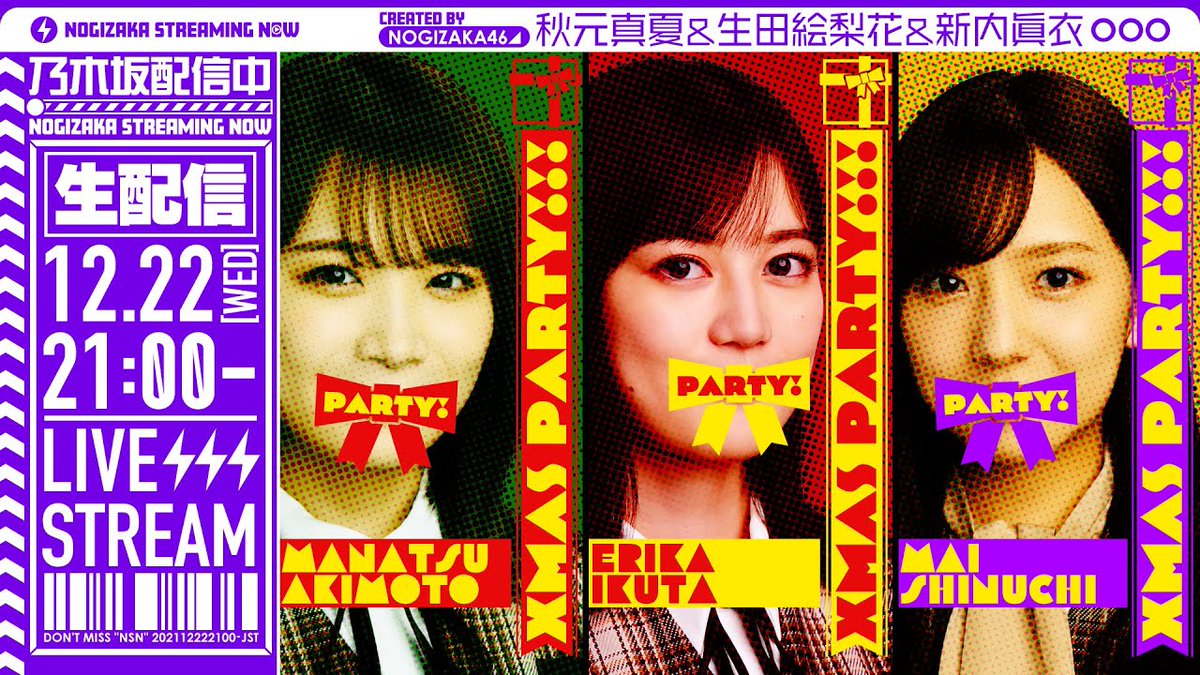 このあと21時〜YouTubeチャンネル「乃木坂配信中」にてクリスマスパーティー生配信です🎄 生田絵梨花が秋元真夏、新内眞衣と3人で最後の生配信🎞 ぜひ皆さまお見逃しなく⭐️ #乃木坂46 #乃木坂配信中 #秋元真夏… https://t.co/hsy9igXEDM